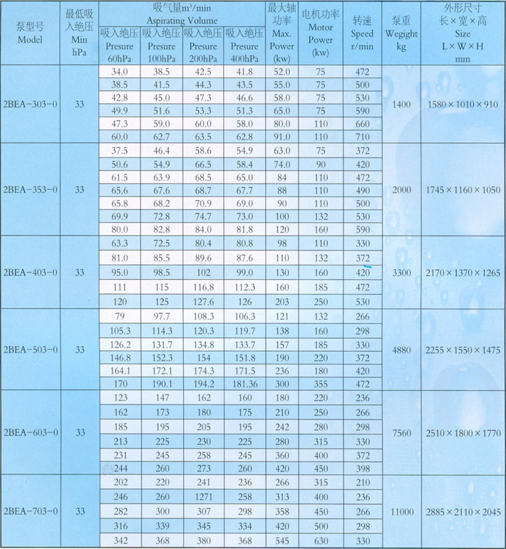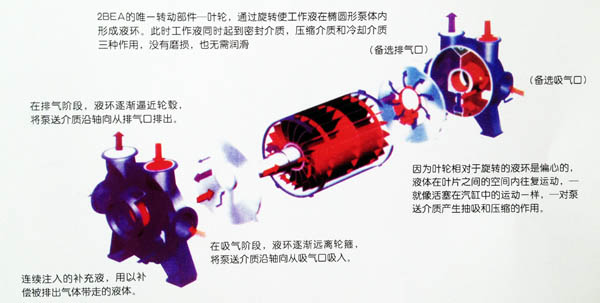 用途及特点: 2BEA系列水环真空泵及压缩机,是我公司在多年科研成果和生产经验的基础上,结合国际同类产品先进技术,研制开发的高效节能产品,通常用于抽吸不含固体颗粒,不溶于水,无腐蚀性的气体,以便在密闭容器中形成真空和压力。通过改变结构材料,亦可用刊由吸腐蚀气体或以腐蚀性液体作工作液。广泛用子造纸、化工、石化、轻工、制药、食品、冶金、建材、电器、洗煤、选矿、似巴等行业。 本系列泵采用单级单作用的结构形式,具有结构简单,维修方便,运行可靠,高效节能的优点,并能适应排水量大.载荷冲击波等恶劣工况。 我们对关键部件,如分配板,叶轮和泵轴进行了系统优化设计,简化了结构,提高了性能,实现节能。采用焊接片一次冲压、成形,型线合理;轮毅全部加土,从根本上解决了动平衡问题,叶轮与泵轴采用热装过盈配合,性能可靠,运行平稳。叶轮焊接后,整体进行良好的热处理,叶片具有良好的韧性,使叶片的抗冲击,抗折弯能力得以根本保证,能适应载荷冲击波动的恶劣工况。 2BEA系列泵,自带气水分离器,多位置没有排气口,泵盖设有排气阀检修窗口,叶轮与分配板间隙通过定位轴承两端压盖调整,安装使用方便,操作简单,便于维修。