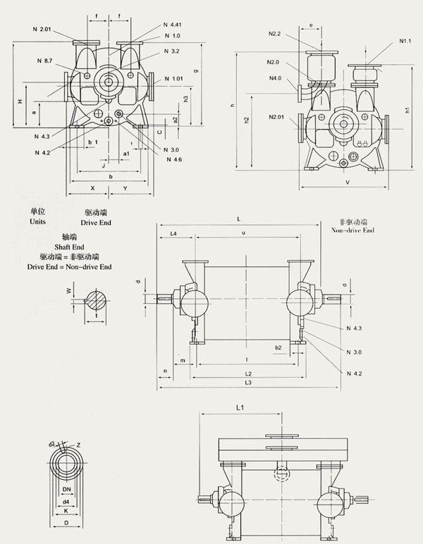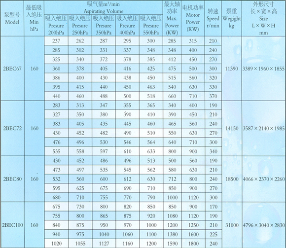 用途及特点: 2BEC系列水环真空泵及压缩机,是我公司在多年科研成果和生产经验的基础上,结合国际同类产品先进技术,研究开发的高效节能产品,通常用于抽吸不含固体颗粒,不溶于水.无腐蚀性的气体,以便在密闭容器中形成真空和压力。通过改变结构材料,亦可用于抽吸腐蚀气体或以腐蚀液体作工作液。广泛川于造纸、化工、石化、轻工、制药、食品、冶金、建材、电器、洗煤、选矿、化肥等行业。 本系列泵采用单级单作用的结构形式,具有结构简单,维修方便,运行可靠,高效节能的优点,并能适应排水量大,载荷冲击波动等恶劣工况。 我们对关键部件,如分配板,叶轮和泵轴进行了系统优化设计,简化了结构,提高了性能,实现节能。采用焊接叶轮,叶片一次冲压、成形,型线合理;轮毅全部加工,从根本上解决了动平衡问题。叶轮与泵轴采用热装过盈配合,性能可靠,运转平稳。叶轮焊接后,整体进行良好的热处理,叶片具有良好的韧性,使叶片的抗冲击,抗折弯能力得以根本保证,能适应载荷冲击波动的恶劣工况。 2BEC系列泵,自带气水分离器,多位置设有吸排气口,泵盖设有排气阀检修窗口,叶轮与分配板间隙通过定位轴承两端压盖调整,安装使用方便,操作简单,便于维修。