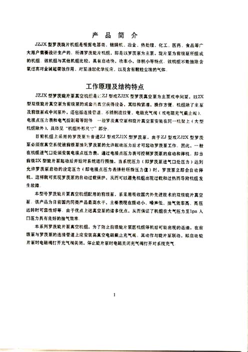 JZJ2S系列罗茨水环机组是由ZJ型罗茨泵作为主抽泵,2SK双级水环泵或罗茨--水环机组作为前级泵组成的抽气机组。它除了可以用来抽除一般气体外,还可以抽吸含有水分或少量灰尘的气体。即与一般机械真空泵相比,不怕油污染,不怕水气及微尘,而与一般的水环式真空泵相比,具有真