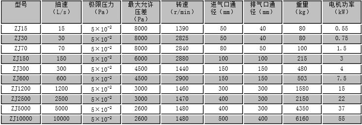 罗茨真空泵主要技术性能规格